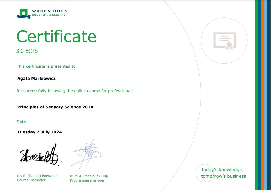 W 2024 roku ukończyła trzymiesięczny kurs Principles of Sensory Science 2024 na Wageningen University & Research Centre, którego certyfikat został wydany w lipcu 2024 roku.